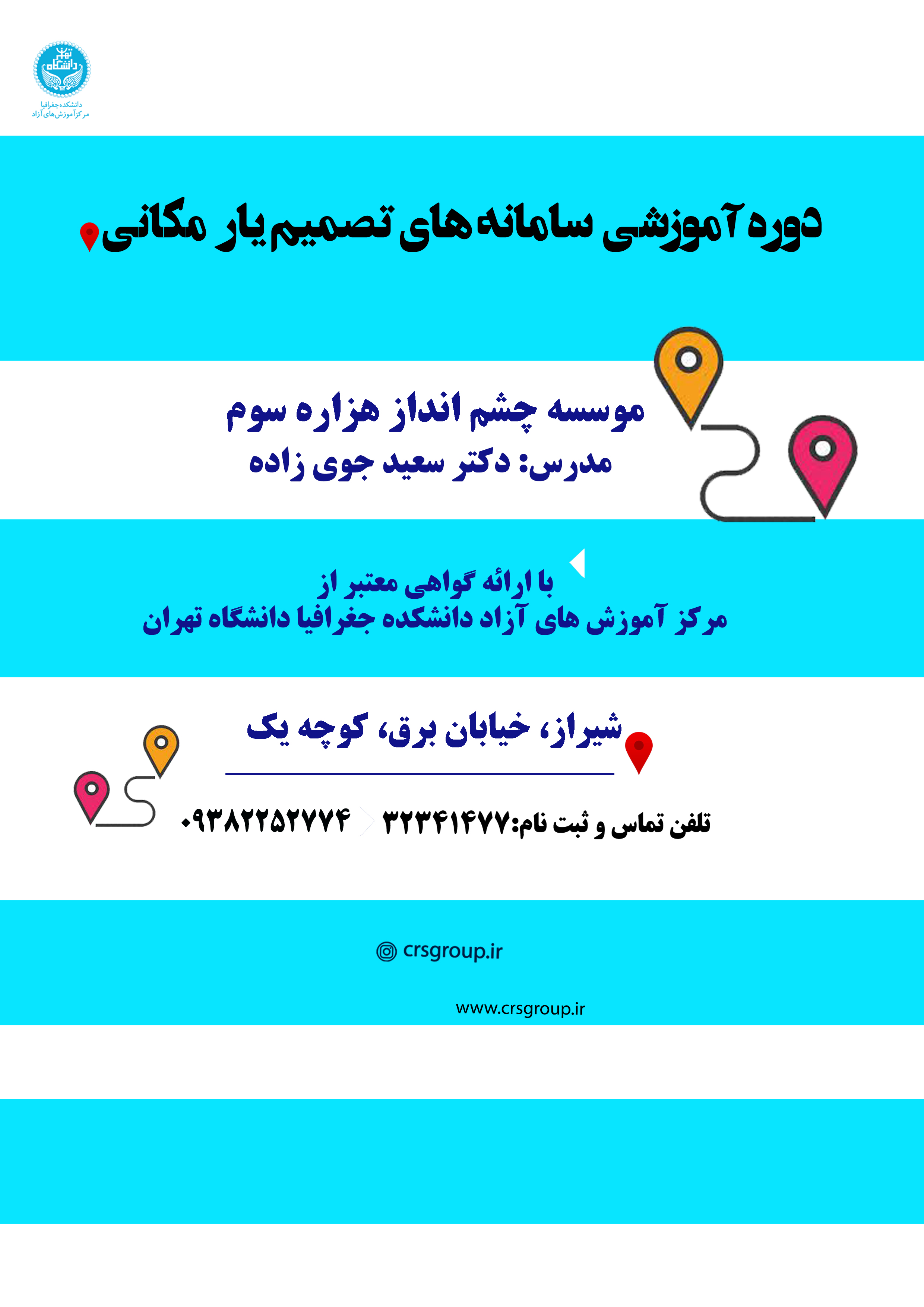 دوره آموزشی سامانه های تصمیم یار مکانی موسسه چشم انداز هزاره سوم مدرس: دکتر سعید جوی زاده آدرس: شیراز، خیابان برق، کوچه یک تلفن ثبت نام: 07132341477- 09382252774 آدرس سایت: http://crsgroup.ir/