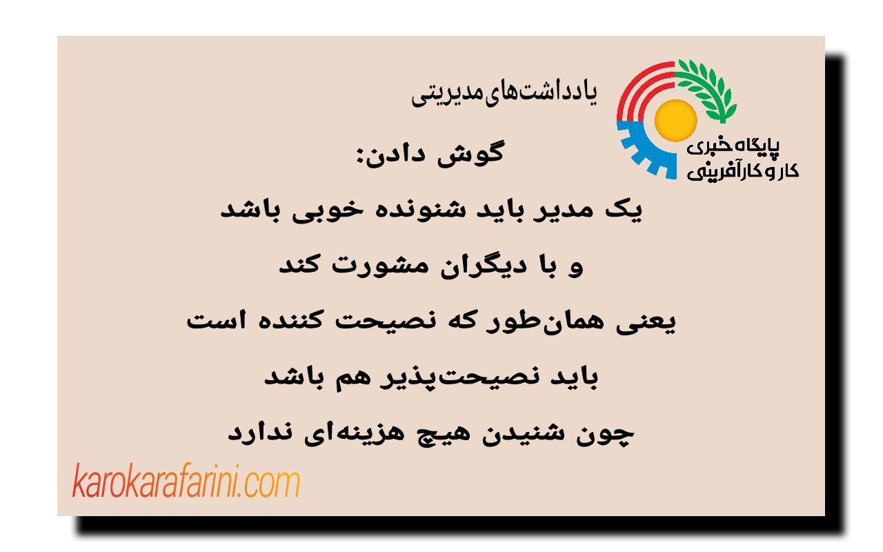 گوش دادن: یک مدیر باید شنونده خوبی باشد و با دیگران مشورت کند یعنی همانطور که نصیحت کننده است باید نصیحتپذیر هم باشد، چون شنیدن هیچ هزینهای ندارد.