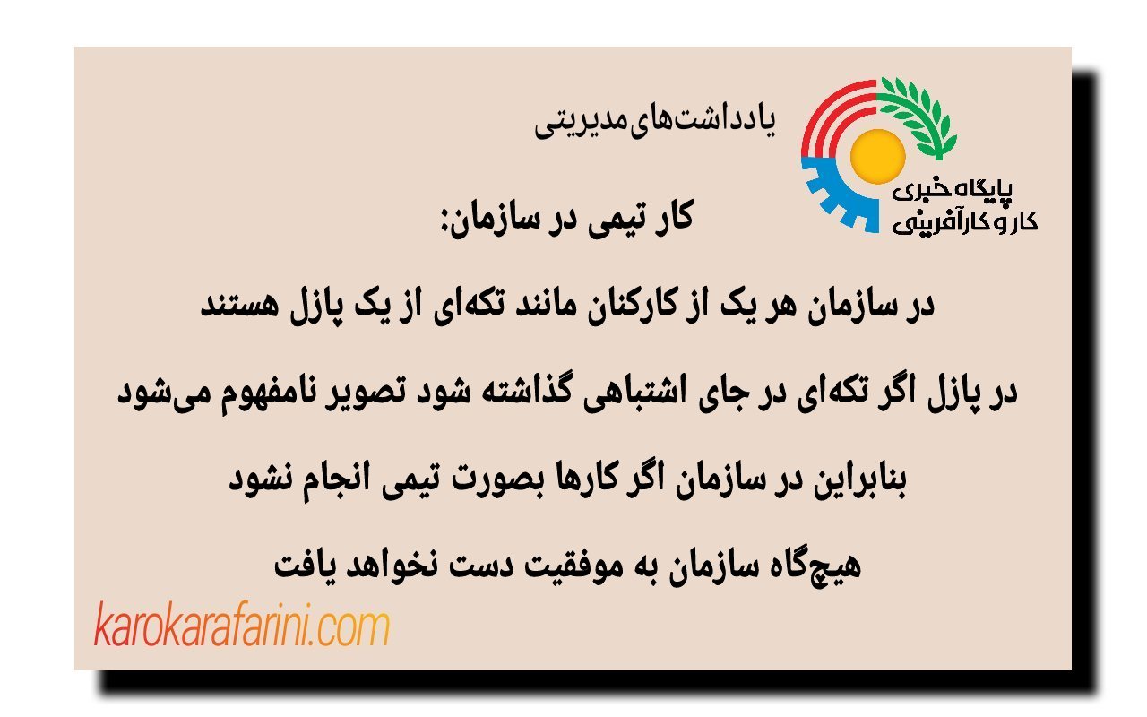 کار تیمی در سازمان: در سازمان هر یک از کارکنان مانند تکهای از یک پازل هستند، در پازل اگر تکهای در جای اشتباهی گذاشته شود تصویر نامفهوم میشود، بنابراین در سازمان اگر کارها بصورت تیمی انجام نشود هیچگاه سازمان به موفقیت دست نخواهد یافت.