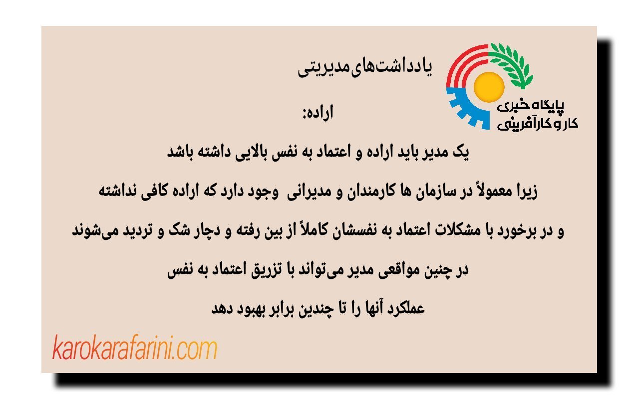 اراده: یک مدیر باید اراده و اعتماد به نفس بالایی داشته باشد زیرا معمولاً در سازمانها کارمندان و مدیرانی وجود دارد که اراده کافی نداشته و در برخورد با مشکلات اعتماد به نفسشان کاملاً از بین رفته و دچار شک و تردید میشوند، در چنین مواقعی مدیر میتواند با تزریق اعتماد به نفس عملکرد آنها را تا چندین برابر بهبود دهد.