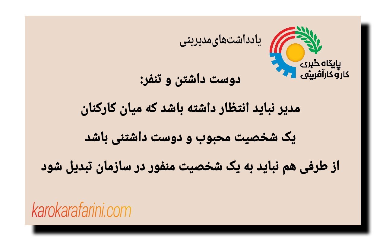 دوست داشتن و تنفر: مدیر نباید انتظار داشته باشد که میان کارکنان، یک شخصیت محبوب و دوست داشتنی باشد، از طرفی هم نباید به یک شخصیت منفور در سازمان تبدیل شود.